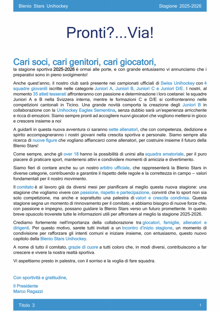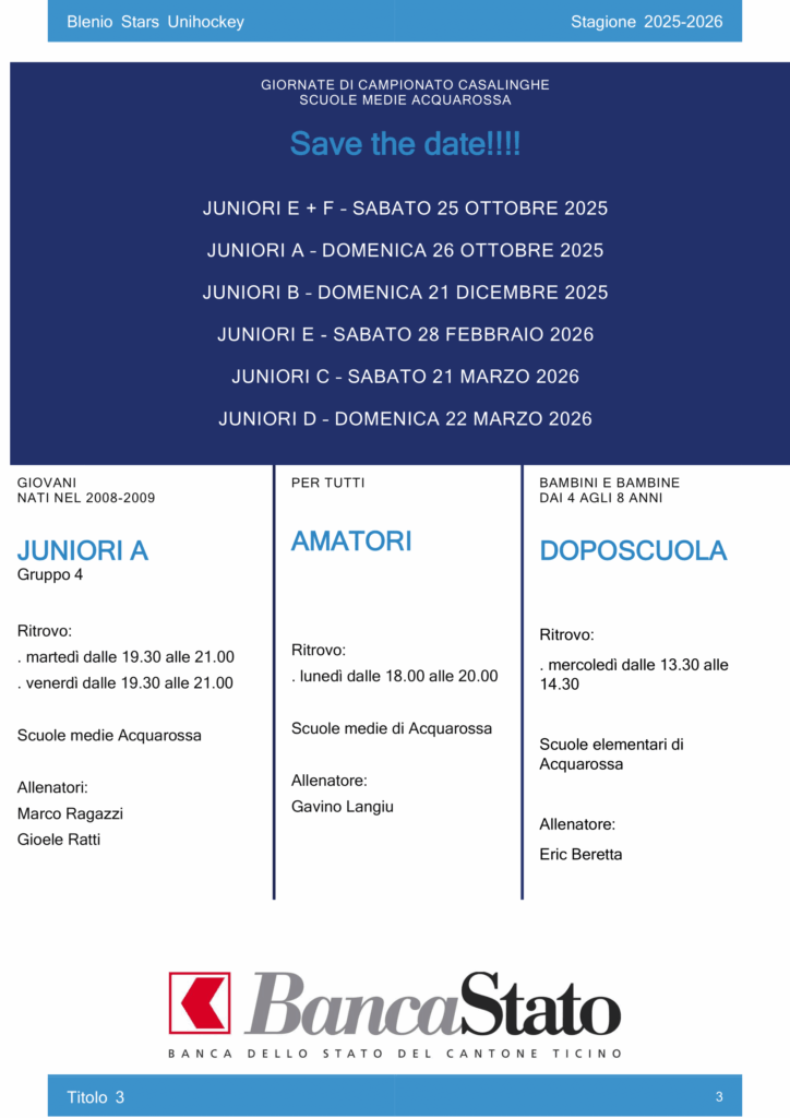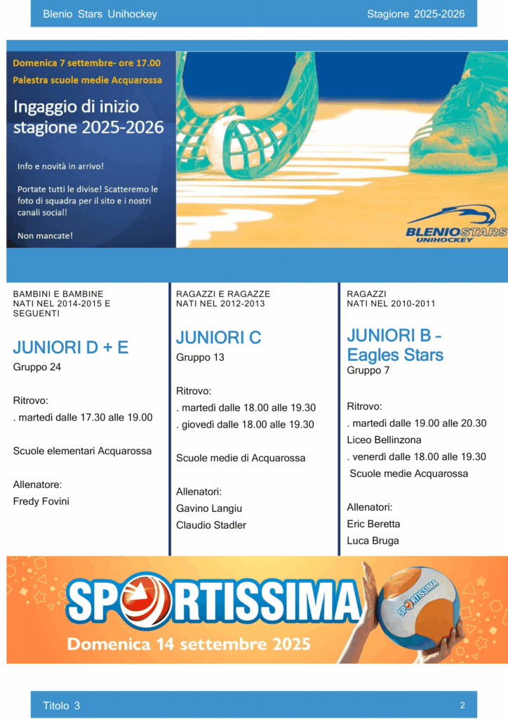 Unihockey Blenio stars Squadre Juniori A Altro Juniori B - Eagles Stars Altro Juniori C Altro Juniori D + E Altro Squadra Amatori Altro Scuola Unihockey Altro Vedi la nostra storia Altro Newsletter Stagione 2025/2026 Prossime Partite & Eventi Scopri le nostre prossime partite ed eventi Altro